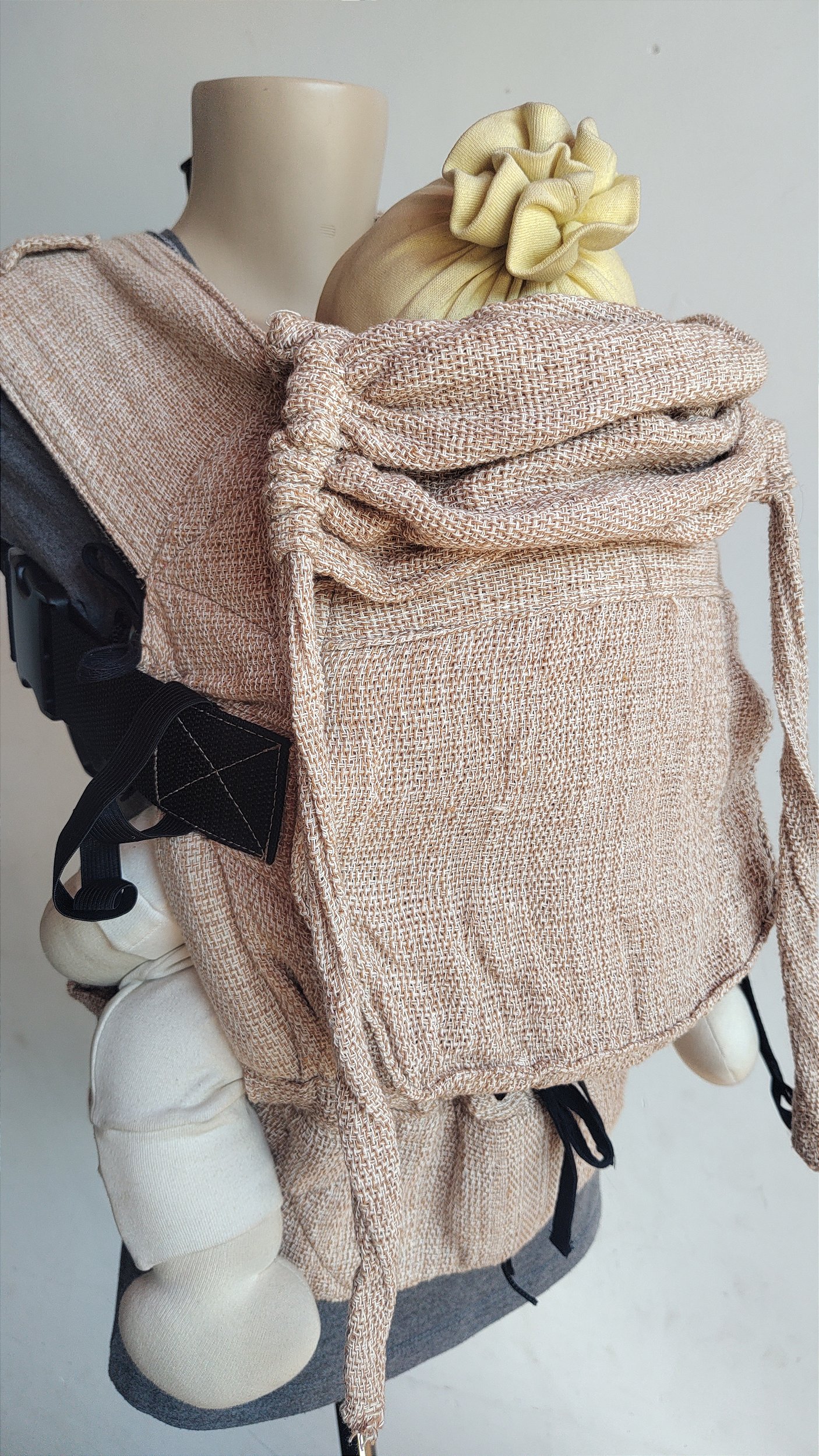 A Mochila Gudou possui o mesmo design e medidas do Meitai Evolutivo, porém, em um design sustentável: menos acolchoado (somente nas perninhas), sem enchimento sintético, e presilhas.